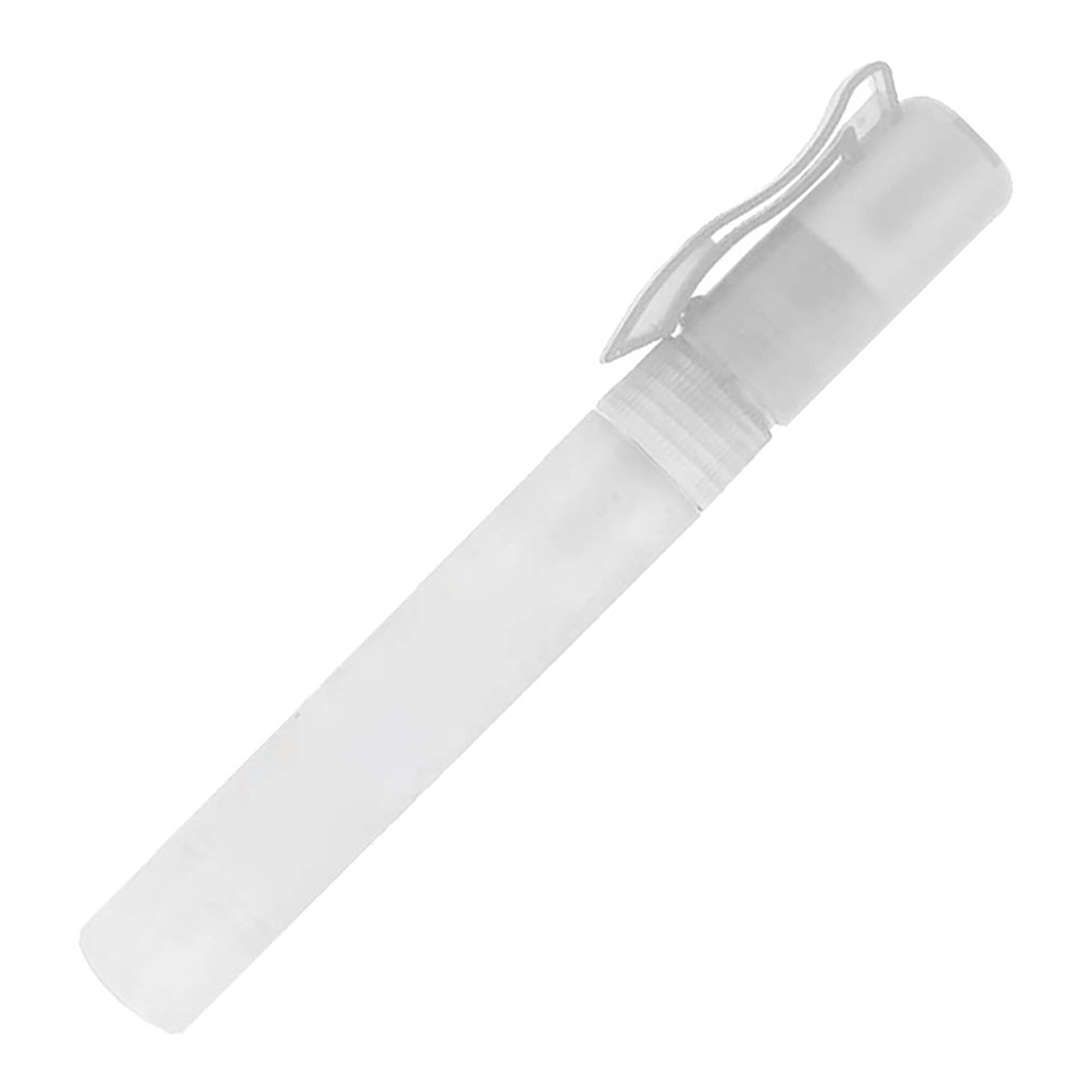 Description: 10ml lightly scented mini spray hand sanitizer in a frost clear plastic tube and cap, pump action to apply, contains 62% alcohol and kills 99.9% of bacteria and germs, meets FDA requirements, small and handy to carry in a hand bag.