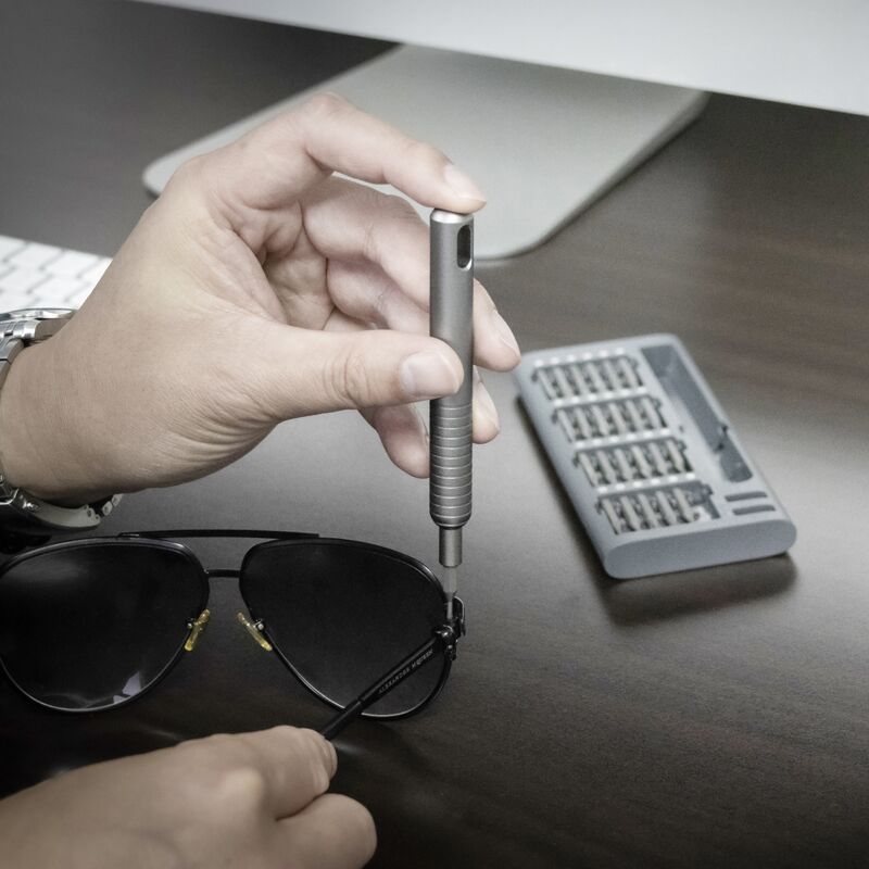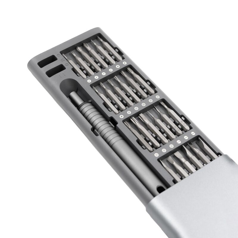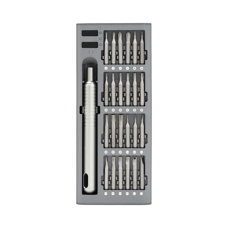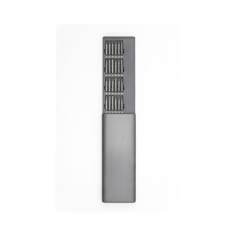 Description: The Everybit Pro is the ultimate high-performance precision screwdriver set. Providing 48 magnetic precision bits manufactured from industrial-grade S2 steel this kit includes all the essential parts for repairing smartphones, tablets, PCs and gaming consoles. This set has a rotating, anti-slip, and anodised handle that magnetises and demagnetises, providing versatility and convenience. It also features slotted, Phillips, Hex, Torx, Pentalobe, Tri-wing Square head, Triangle, U-form, SIM and iPhone standoff bits, making it compatible with iPhone, iPad, MacBook Air, MacBook Pro, Nintendo, PlayStation, and Xbox. Materials: Aluminium, Steel.
