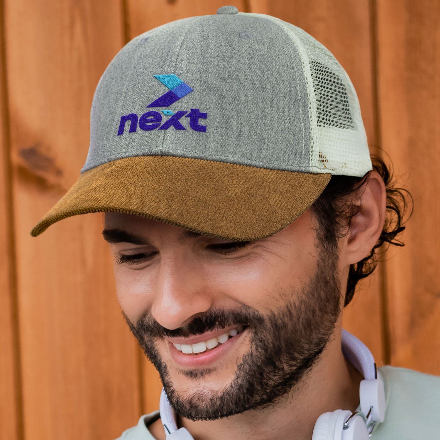 Description: Hard-wearing six-panel heather style corduroy cap which has a mesh back and pre-curved peak, a sweatband, and an adjustable plastic snapback that allows one size to fit most people.