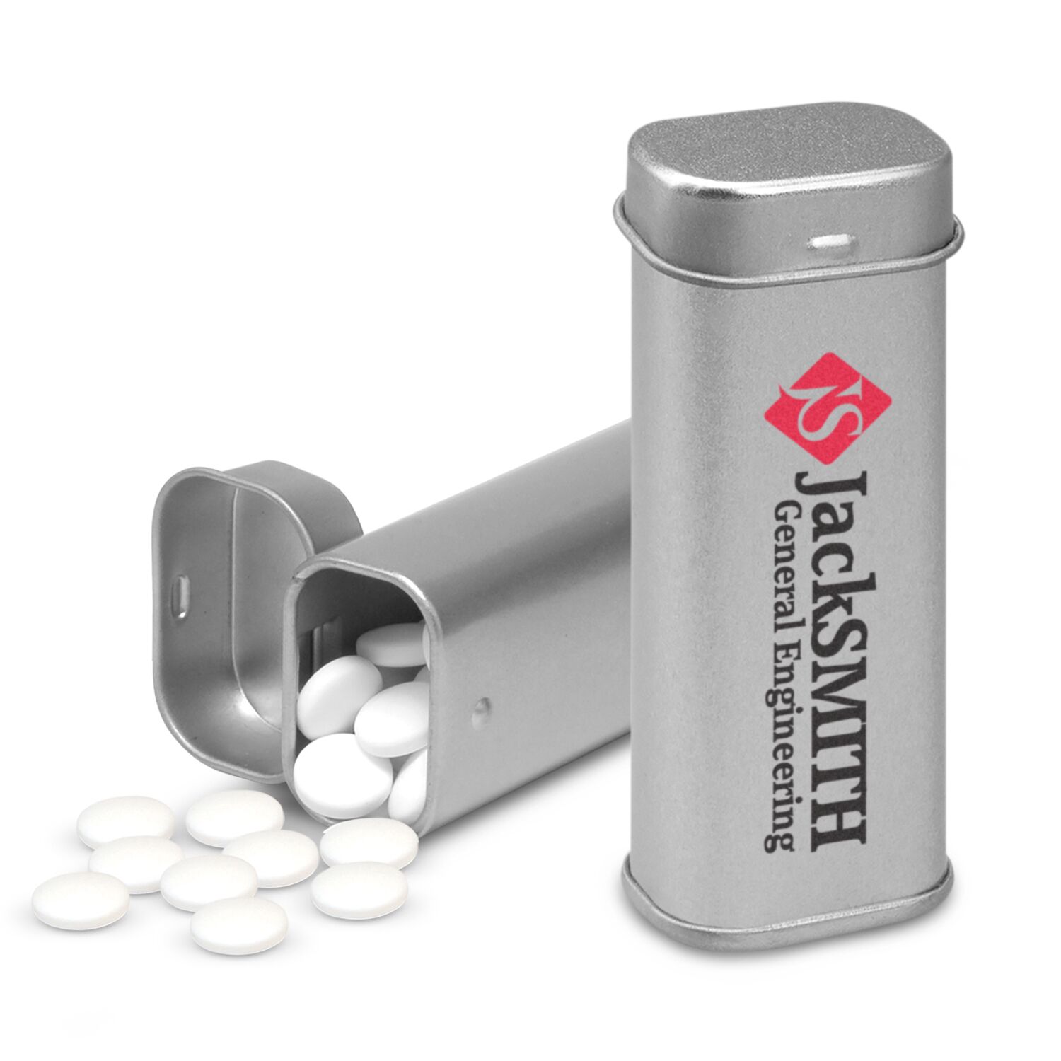 Description: Stylish flip top tin which is filled with 30g of peppermints. Full ingredient and nutritional information is printed on the back of the tin.