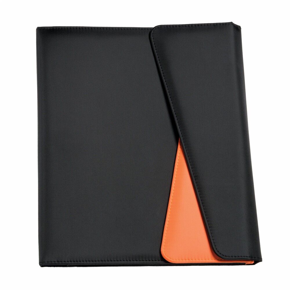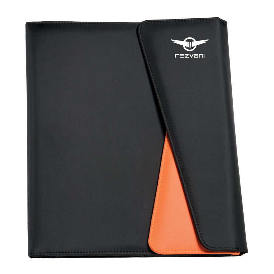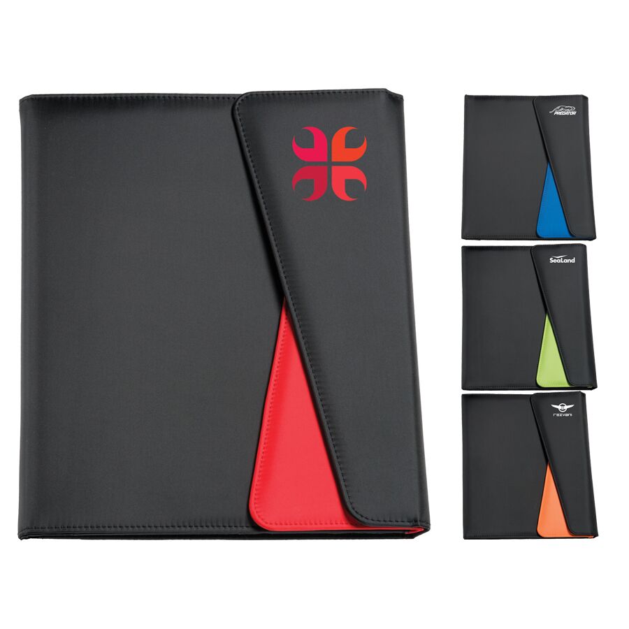 Description: 190T Polyester tri-folder with separate front pocket for document storage, internal business card pockets, pen loop and A4 lined notepad. Both compartments with magnetic closures.