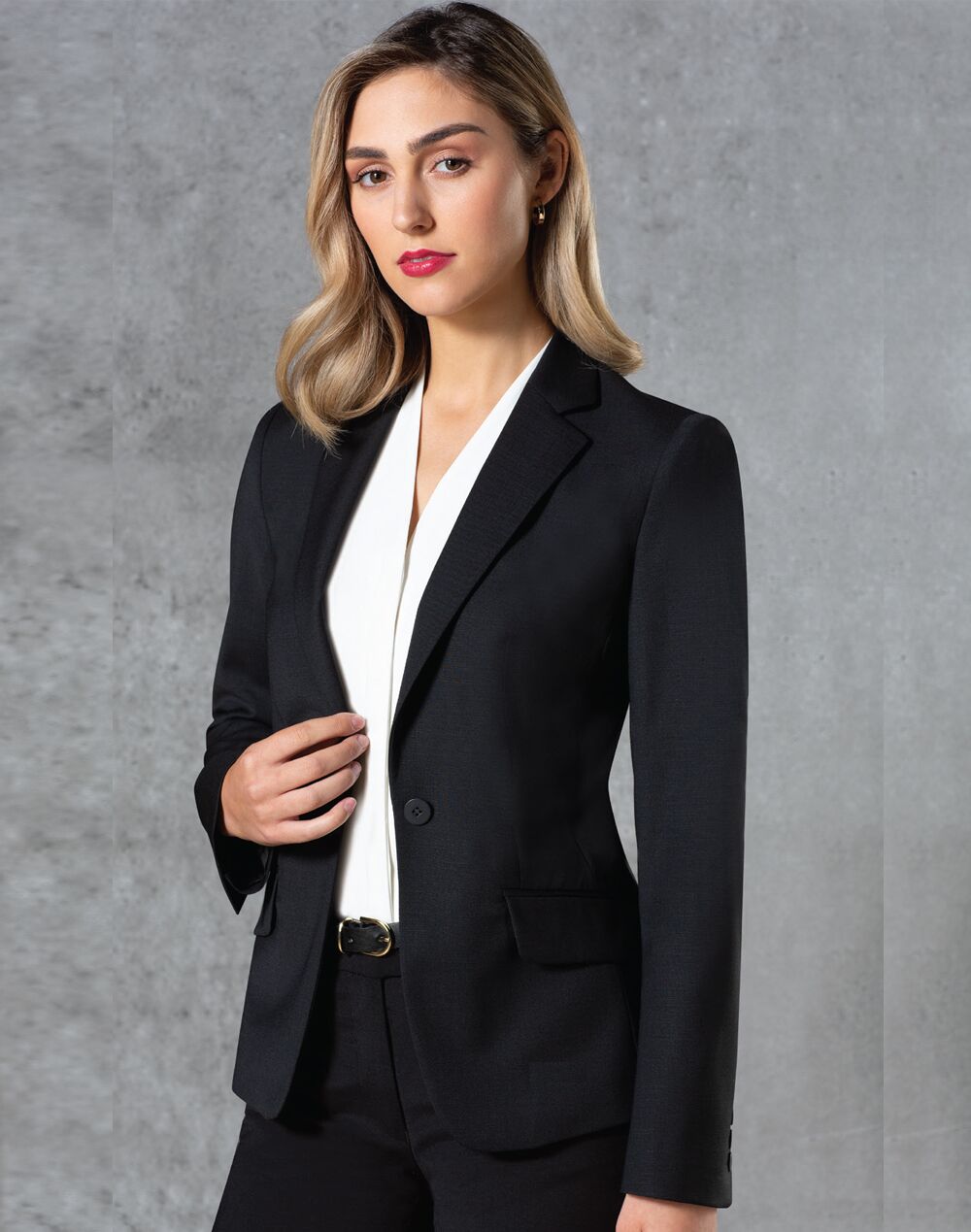 Description: Ladies' Wool Blend Stretch One Button Cropped Jacket Fabric: 53% Polyester, 45% Wool, 2% Lycra Description: One button, single breast tailored, centre vent