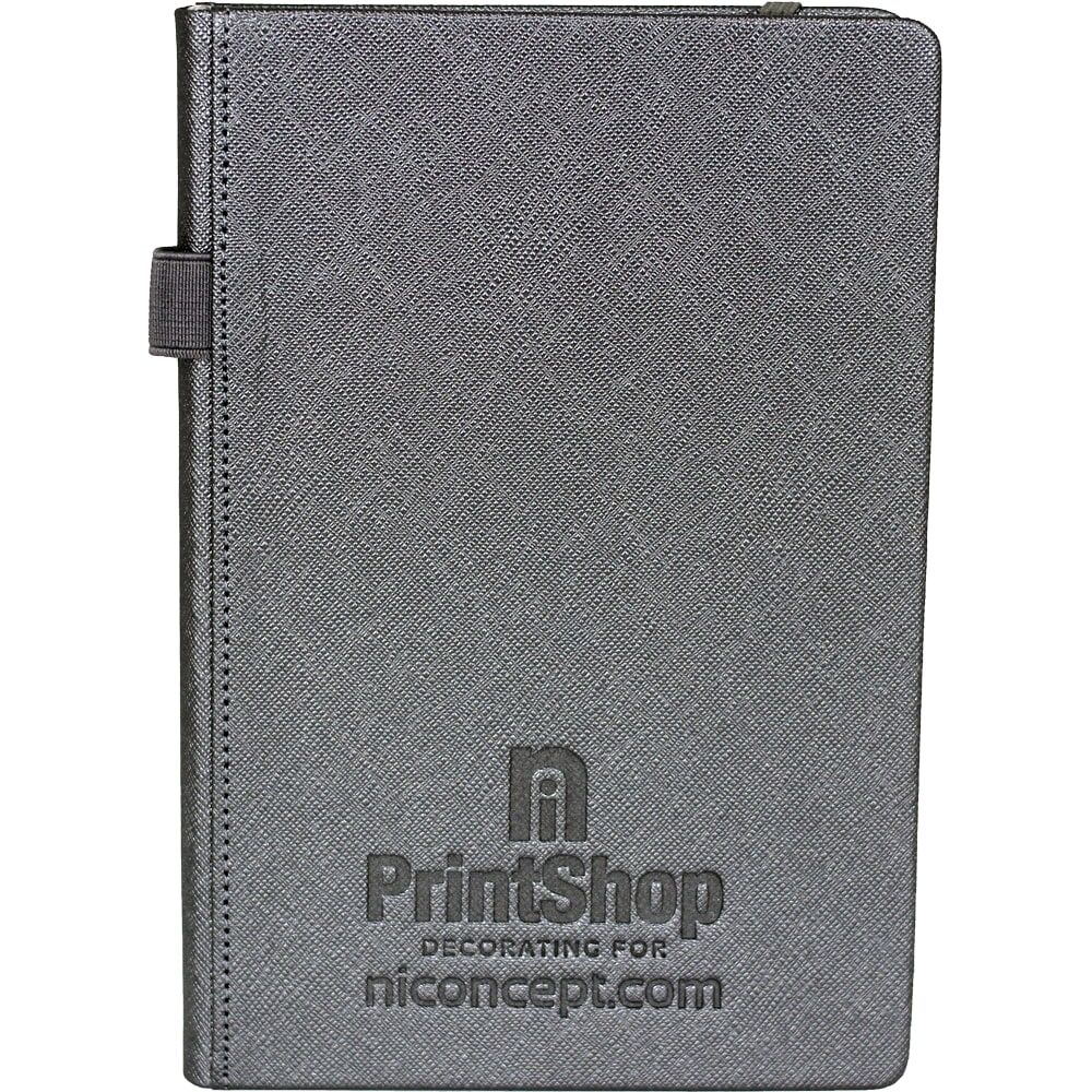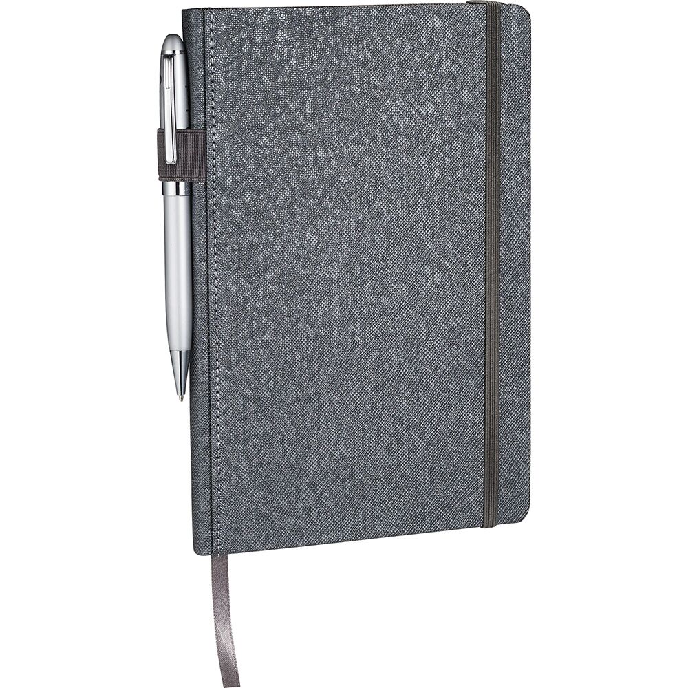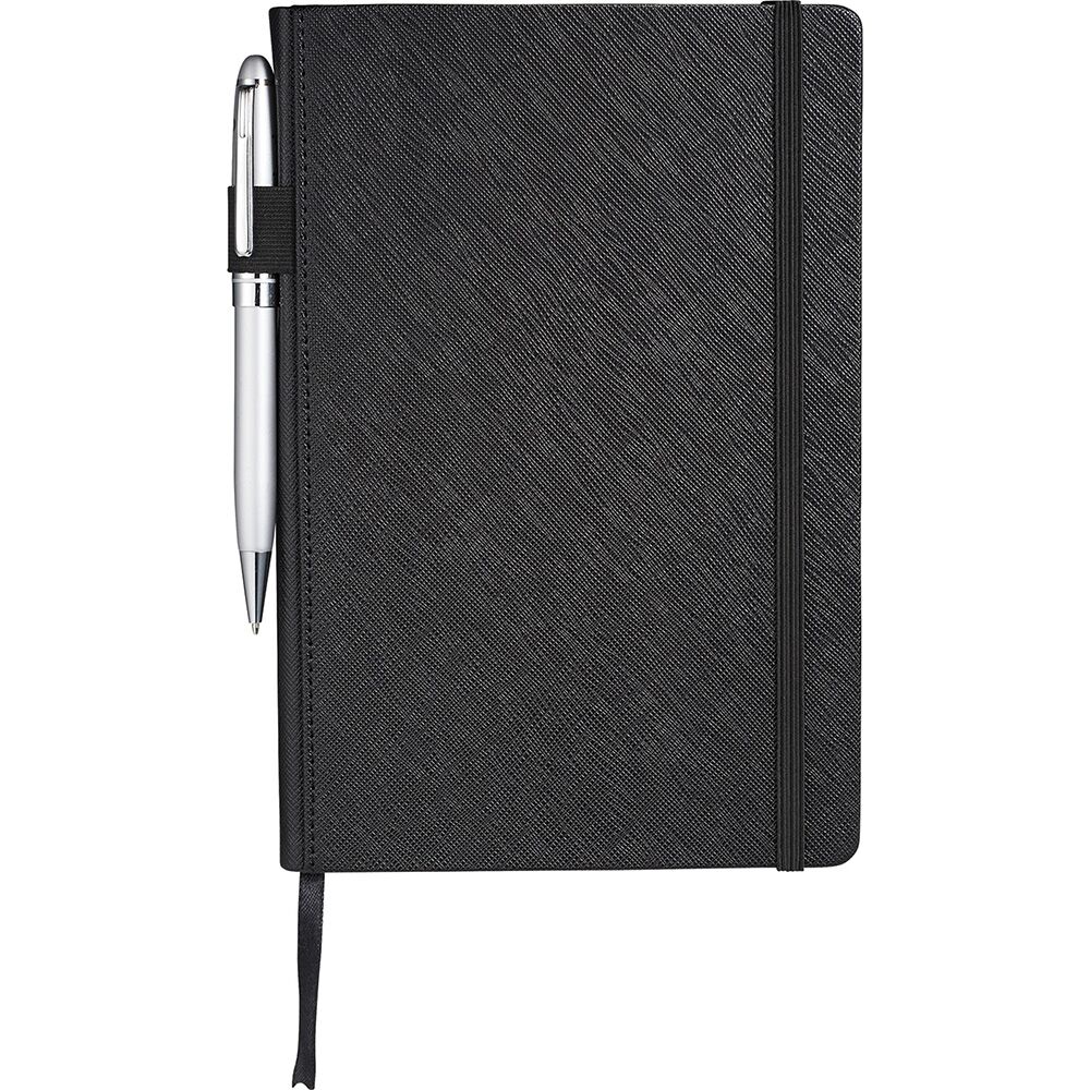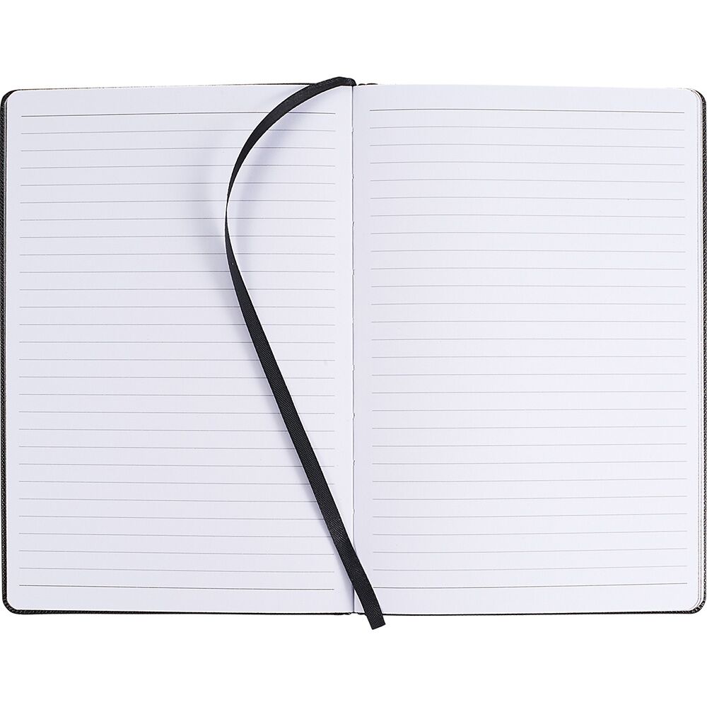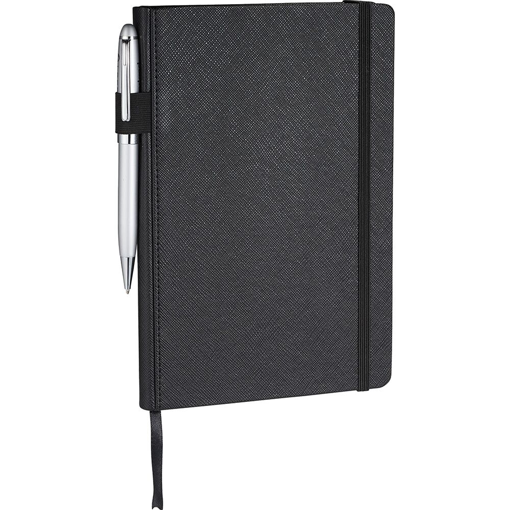 Description: Premium, textured hard cover bound journal. Elastic pen loop on spine. Elastic closure and ribbon page marker. Pen not included. Available in 3 colours.