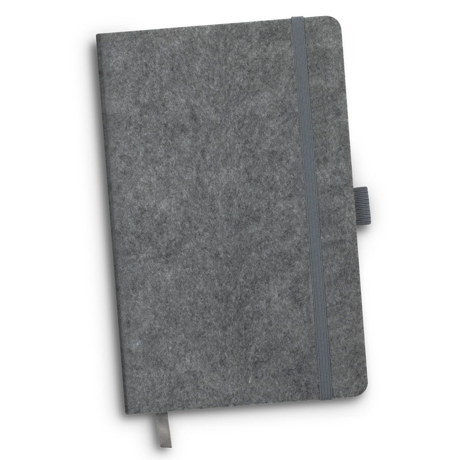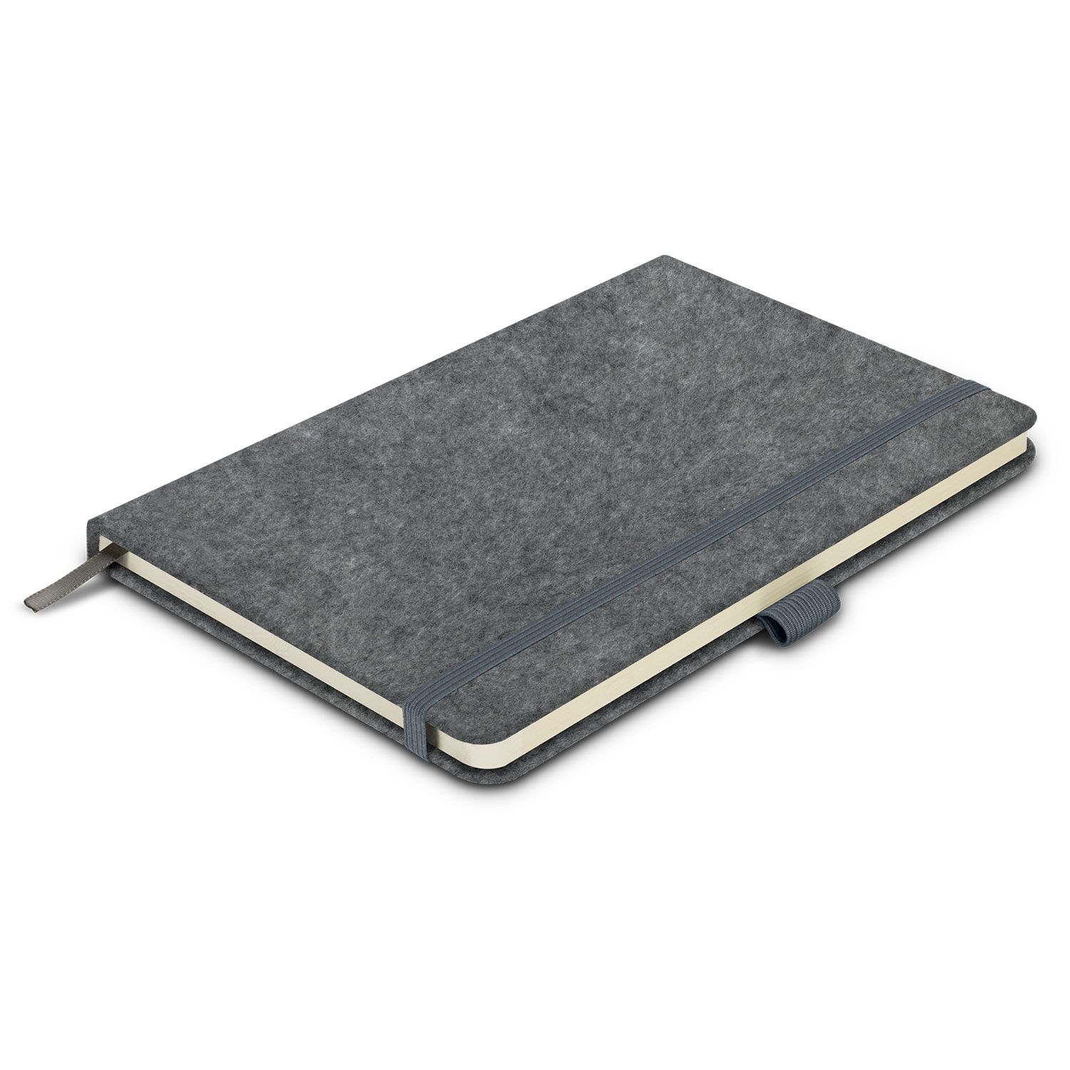 Description: Exceptional A5 notebook with 70 leaves (140 pages) of 80gsm lined cream paper and a bookmark ribbon. It has a hard cover manufactured from recycled post-consumer polyester with an elastic closure and pen loop.