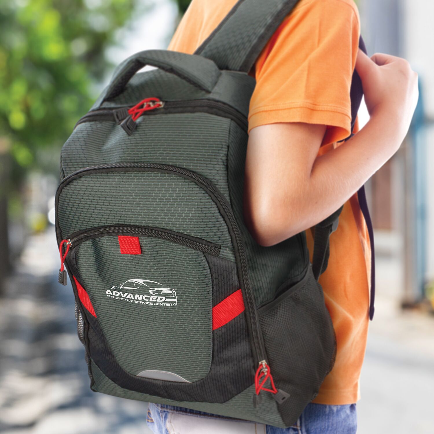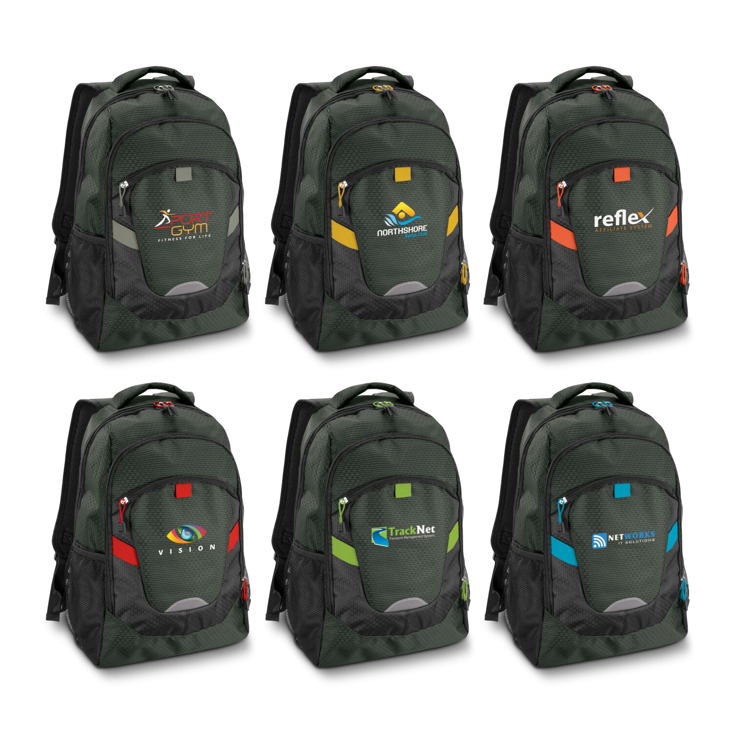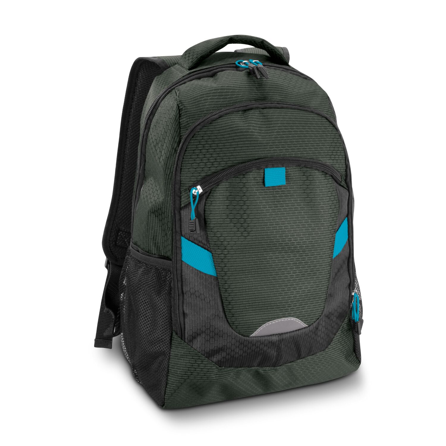 Description: Attention-grabbing backpack with outstanding design and superb functionality. It is manufactured from a stunning two-tone combination of patterned 300D polyester with a 600D polyester back panel and 210D lining. Summit has a large zippered main compartment with a padded laptop sleeve and two smaller external compartments with zippers. It has a padded back and adjustable shoulder straps with breathable padding for extra comfort. Other features include two mesh side pockets, a padded carry handle, a hi-vis reflector on the front, smart elastic zipper pulls and trendy coloured accents.