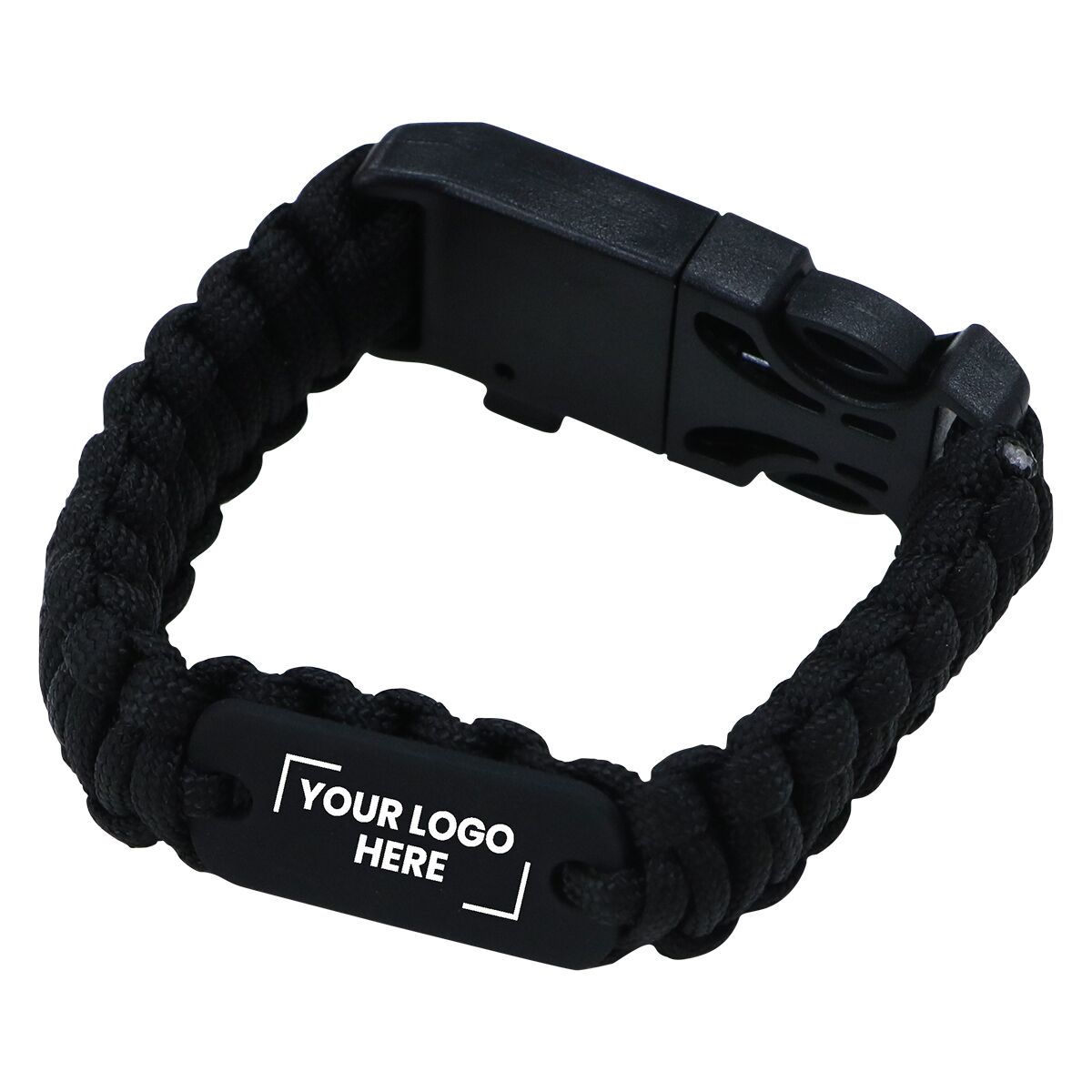 Description: Cut ropes, navigate terrain and look incredible while doing it. Presenting the Survival Band, the ultimate product of the outdoors and the branding world. Featuring a compass, fire starter and whistle, all connected by a thick cord that can be cut and used as a rope, the Survival Band truly has it all. Make a unique impact this year unparalleled by any other product.
