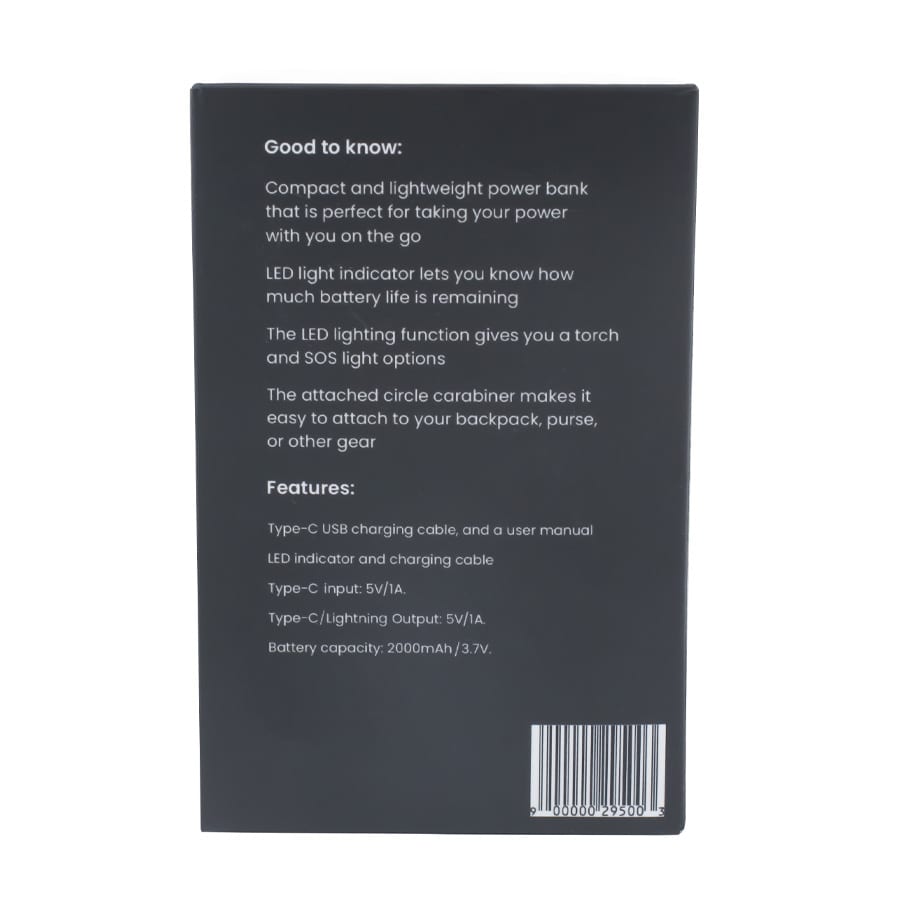 Description: Introducing our Thorfinn 2,000mAh Mini Power Bank, a mini size built-in charging bank with charging cable Built-in type C and flash line + flashlight + Type C charging cable.