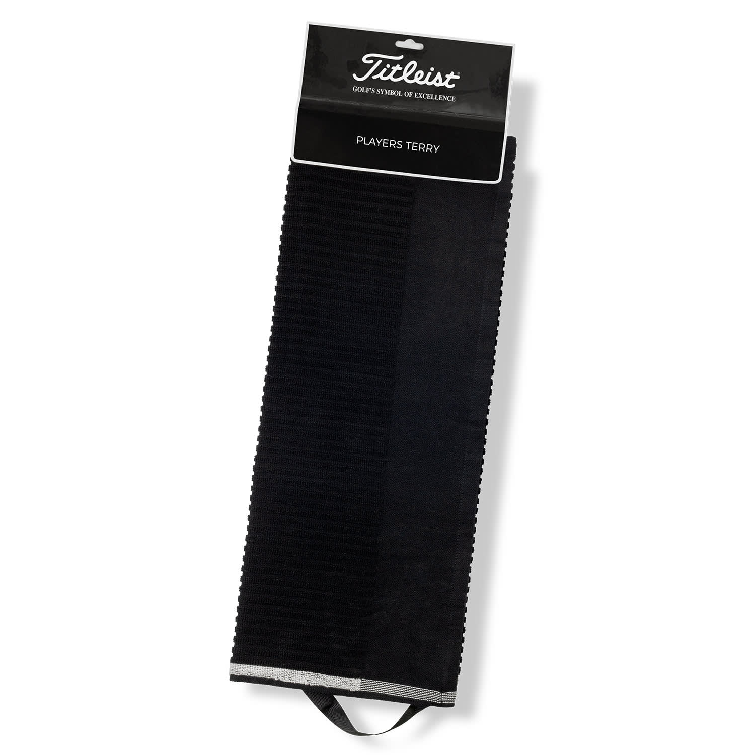 Description: This premium golf towel from Titleist is made using cotton terry towelling, using full-loop terry cloth for maximum absorption. Measuring 500mm x 1000mm, the towel has a handy loop for attaching to a golf caddy and is the perfect companion on the green to keep gear clean and dry. The towel is presented on a Titleist branded heading card and features the Titleist logo on a sewn-in label.