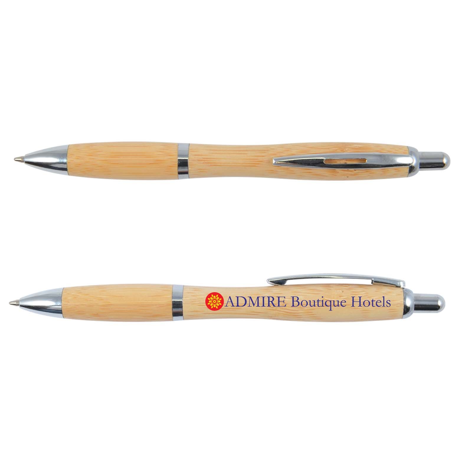 Description: Push button ballpoint pen made from Bamboo, one of the world's fastest growing plants. Writing distance: 2.1 kilometres. Eco Credentials. Renewable. Sustainable. Printed using reusable energy.