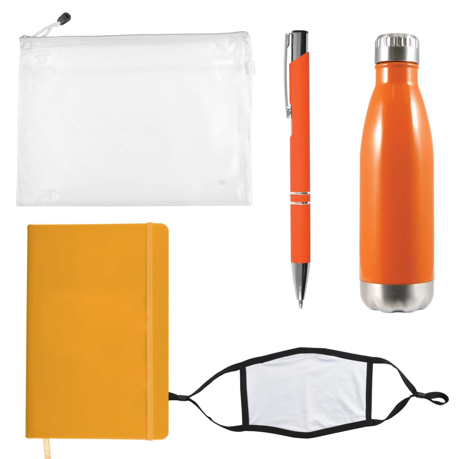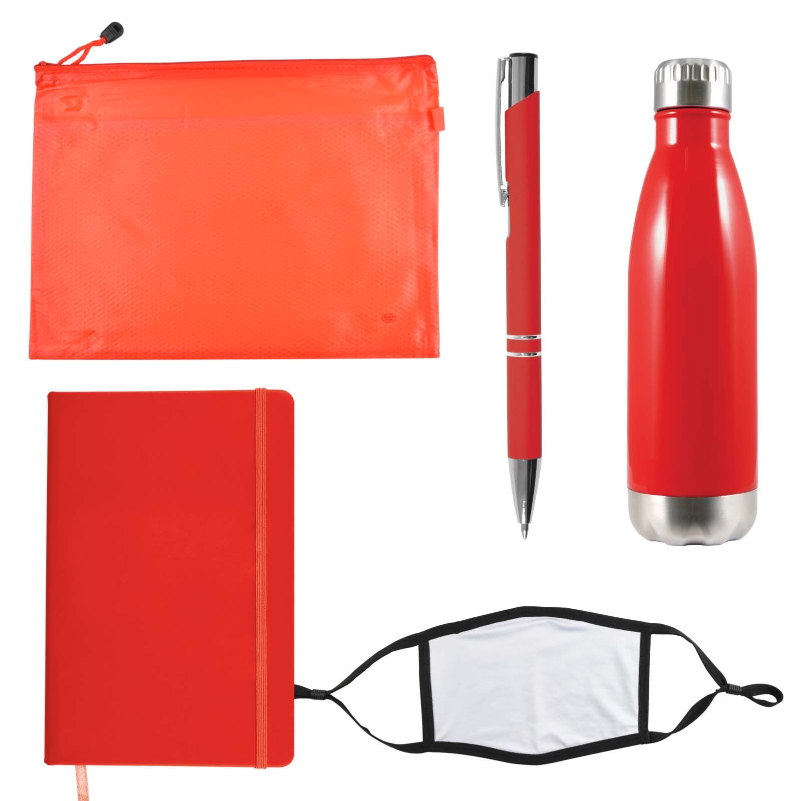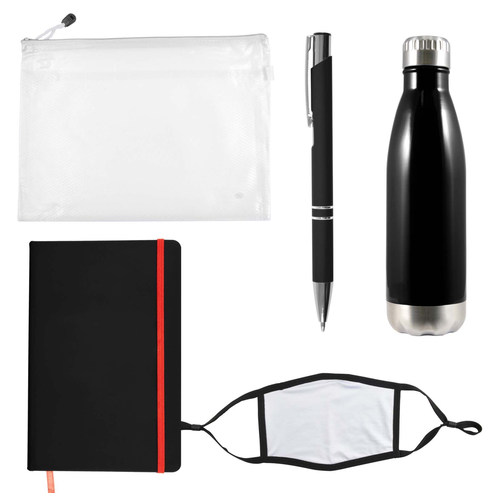 Description: Wellbeing pack in Zippered Pouch with Soda Stainless Steel Drink Bottle, Venture Notebook, Napier Deluxe Pen and Shield Face Mask. Great for employees, customers, students and for delegates at events and conferences.