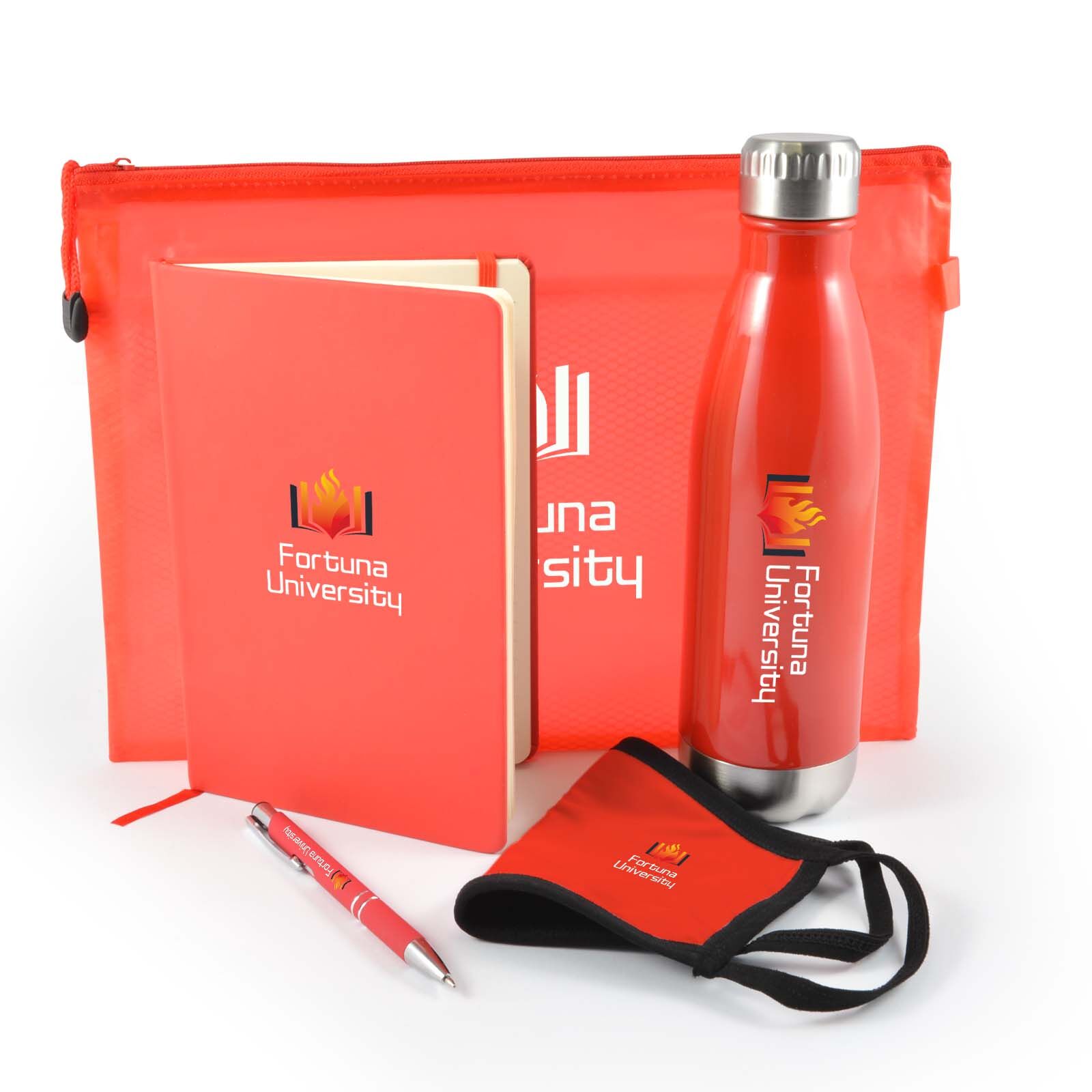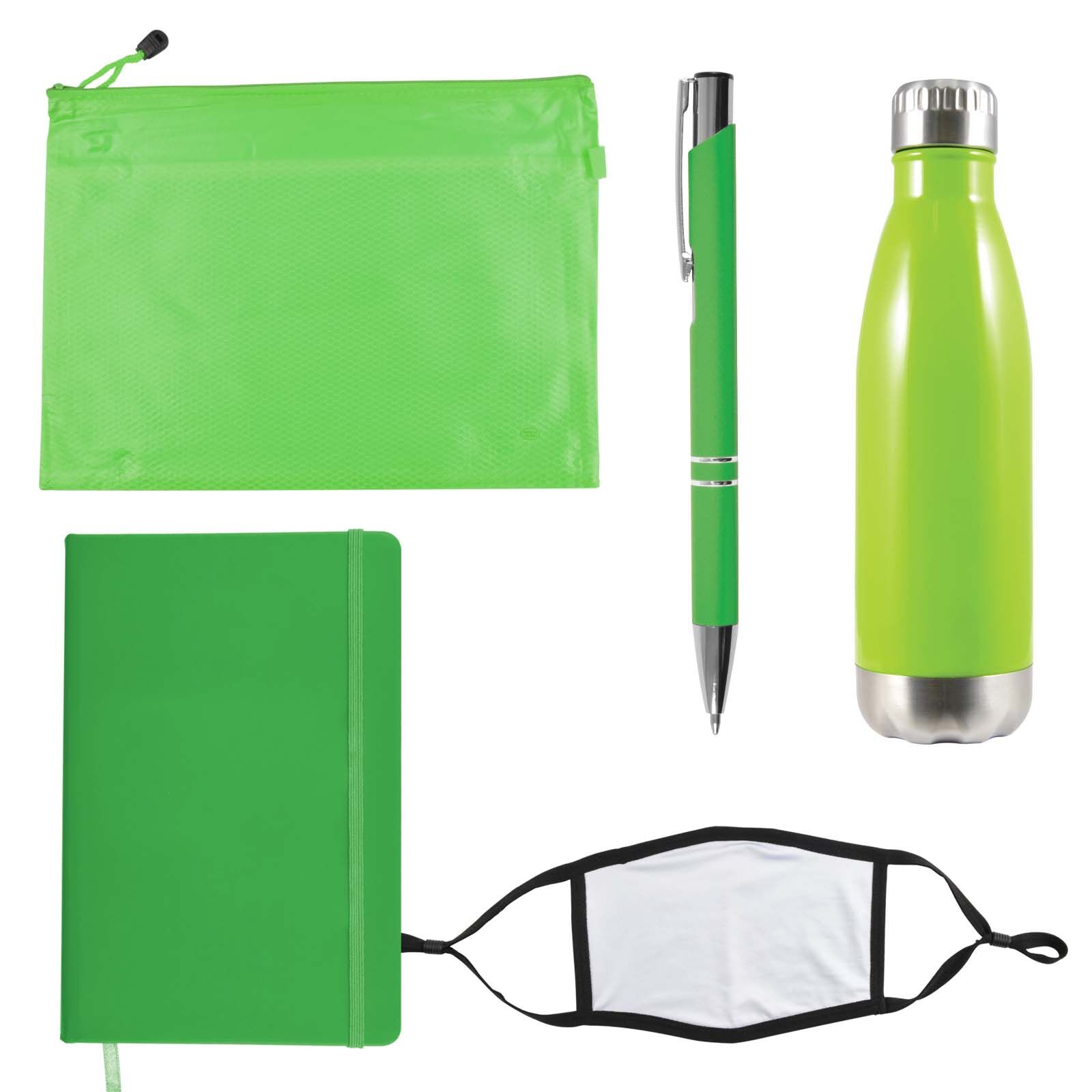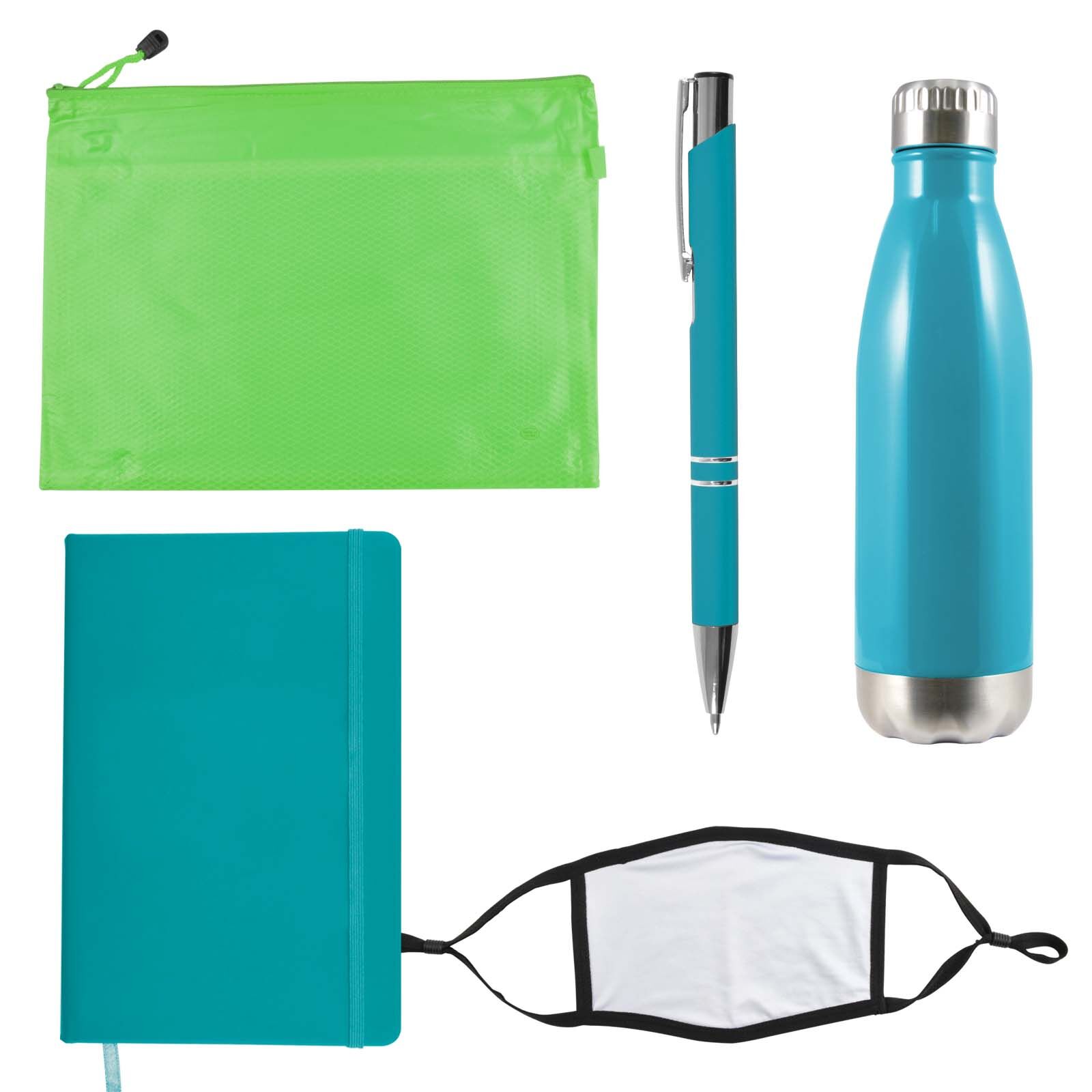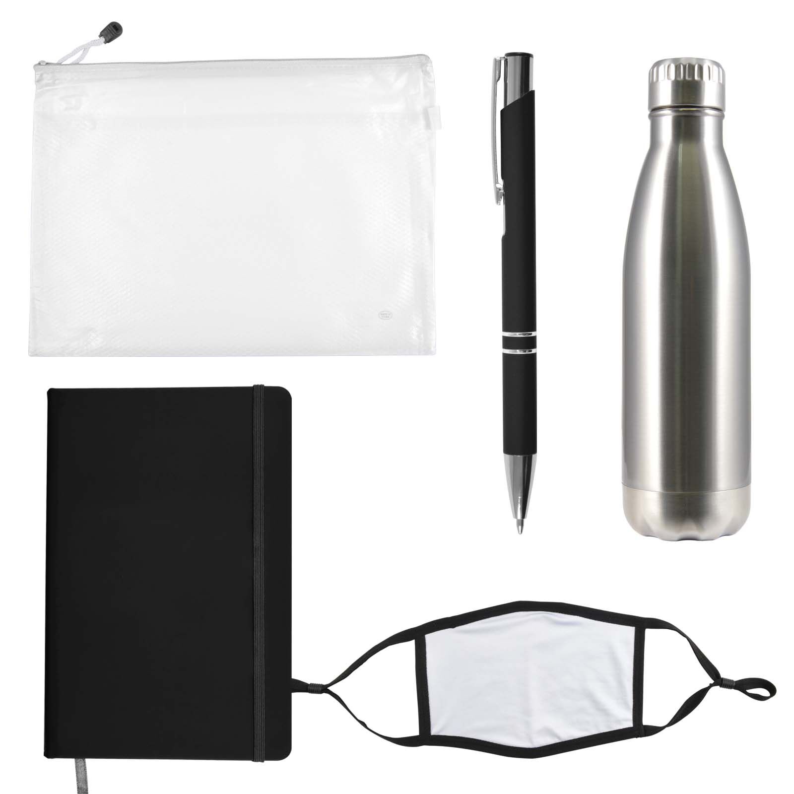 Description: Wellbeing pack in Zippered Pouch with Soda Stainless Steel Drink Bottle, Venture Notebook, Napier Deluxe Pen and Shield Face Mask. Great for employees, customers, students and for delegates at events and conferences.